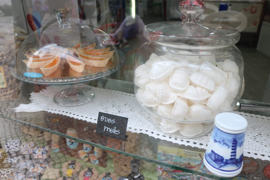 Nós provamos, é claro! Eu e meus pais, porque as meninas escolheram os tradicionais brigadeiros que também eram vendidos na confeitaria! Além de aguçar o paladar, a origem do doce também é interessante e curiosa: os tradicionais ovos moles de Aveiro têm origem no século XVI, no Convento de Jesus de Aveiro. Segundo registros, enquanto as claras de ovos eram usadas para serviços domésticos – como engomar roupas, por exemplo – as gemas eram descartadas. Até que uma das freiras teve a brilhante ideia de juntar açúcar e criar essa maravilha. Depois de fechado o templo, a receita se perpetuou através de uma empregada das religiosas. A história conta ainda que o formato (servidos em hóstias, obreia) é por influência das formas que remetem à cidade de Aveiro: peixes, búzios ou conhas do mar.