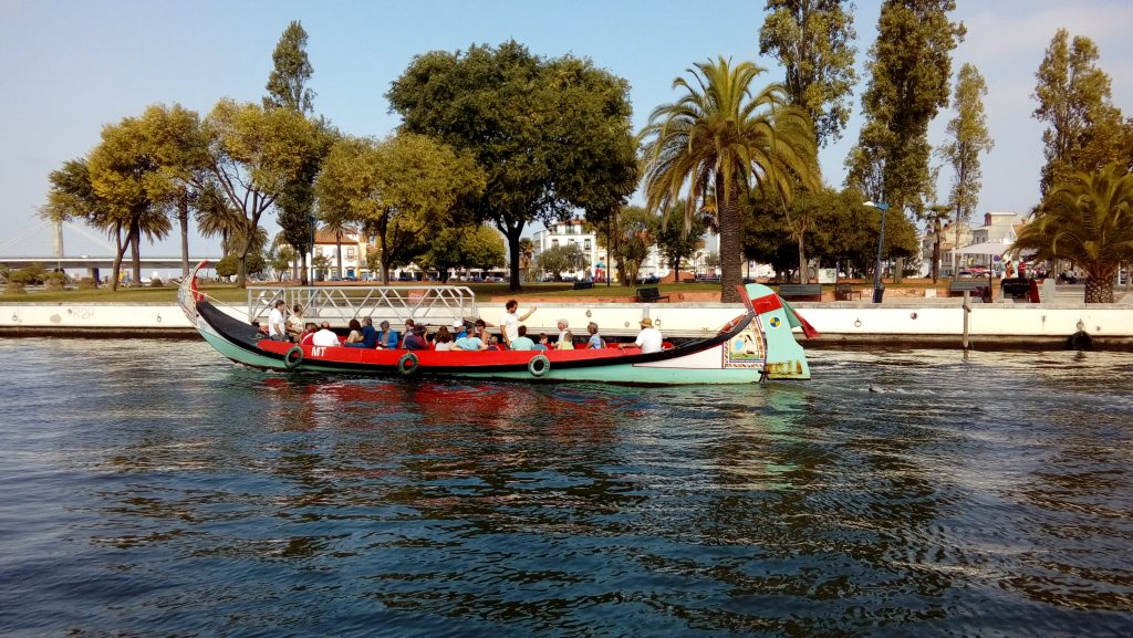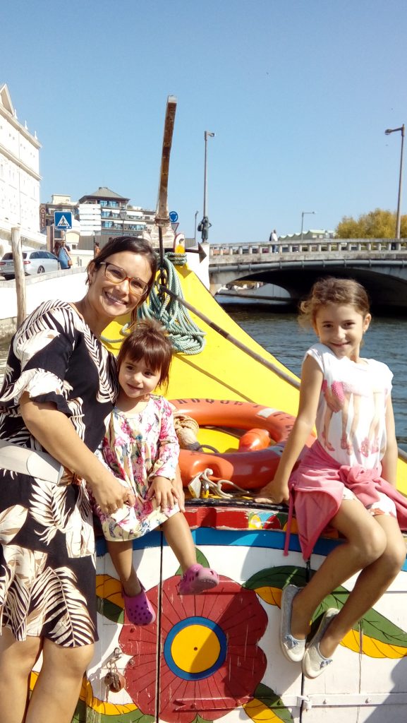 O dia não poderia estar melhor: sol e temperaturas agradáveis. Eu, as crianças (minhas filhas Sophia e Isabella) e meus pais saímos de Braga de manhã e percorremos cerca de 130 quilômetros de carro até a Aveiro, a cidade conhecida como Veneza Portuguesa. O motivo? Os canais da Ria que permitem aos visitantes conhecer um pouquinho de Aveiro de dentro dos barcos coloridos, os barcos moliceiros. E logo de chegada, adivinha o que as crianças queriam? O passeio de barco!