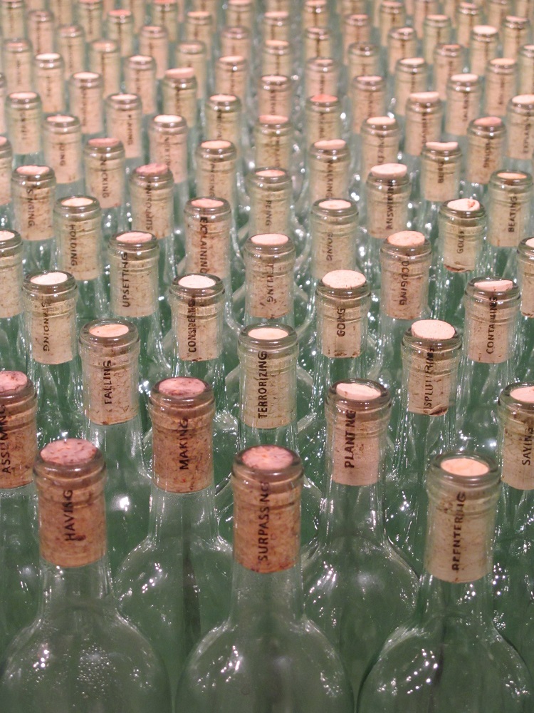 A instalação contém 4.311 gerúndios retirados da edição em inglês de “Ulysses”, impressos (em mesmo número) em cartões-postais e em rolhas inseridas em bocais de garrafas. O gerúndio foi uma escolha proposital da autora, visto que essa forma verbal denota um aspecto duradouro de continuidade e fluxo. Os recipientes de vidro remetem às garrafas atiradas ao fundo do mar, com mensagens em seu interior, que, do mesmo modo como os cartões-postais, em seu gesto de envio, têm “a promessa de um encontro, sem a garantia de chegada” — explica Elida. Para a artista, o encontro da rolha com o bocal da garrafa representa o que ela chama de um “encaixe perfeito” entre uma produção artística e a reflexão crítica por ela suscitada.
