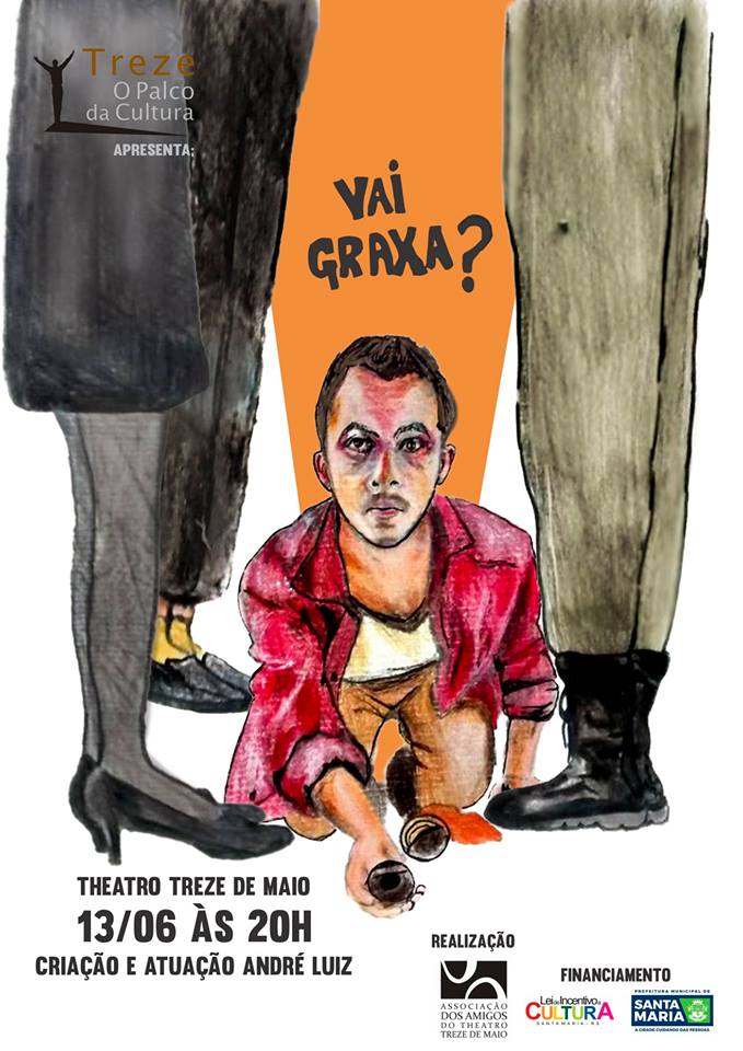 Engraxate filho de uma engraxate. Caminha para longe todos os dias encontrando, engraxando e se tornando diferentes sapatos. Espetáculo de André Luiz, sobre a vida de um engraxate e seu cotidiano nas praças e ruas onde trabalha. Projeto Treze: O Palco da Cultura. Realização: Associação dos Amigos do Theatro Treze de Maio. Financiamento: Lei de Incentivo à Cultura de Santa Maria. Classificação: 16 anos. Ingressos: R$ 15 antecipado público geral; R$ 10 meia-entrada; R$ 20 público geral.