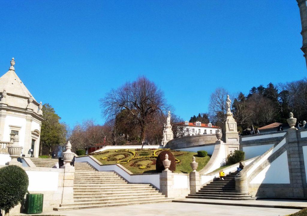 A cada degrau se revela um pouquinho mais de Braga. A vista da cidade vai ficando cada vez mais encantadora à medida que se sobe a escadaria.  É tanto para se observar que nem parece que já se foram quase 573 degraus. Seguindo o passeio, antes do último lance, surge um jardim barroco de encher os olhos, mais fontes, estátuas… E então sobem-se os últimos degraus e chega-se à Basílica, uma construção imponente em estilo neo clássico.