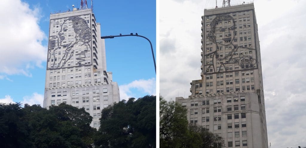 Você pode chegar em Buenos Aires sem conhecer a história de Evita Perón e até fingir não se importar muito, mas é impossível andar pela cidade sem se deparar com a figura dela estampada por aí. Seja nas notas de $ 100 pesos, em um boton na Feira de San Telmo, em um grafite na parede ou a silhueta gigantesca em um prédio no meio da Avenida 9 de Julho. Fato é que a imagem da Cinderela argentina permanece viva, mesmo após sua morte prematura, aos 33 anos, em 1952. Aliás, o falecimento, que remete à idade de Cristo, contribuiu para muitos a compararem a uma santa.