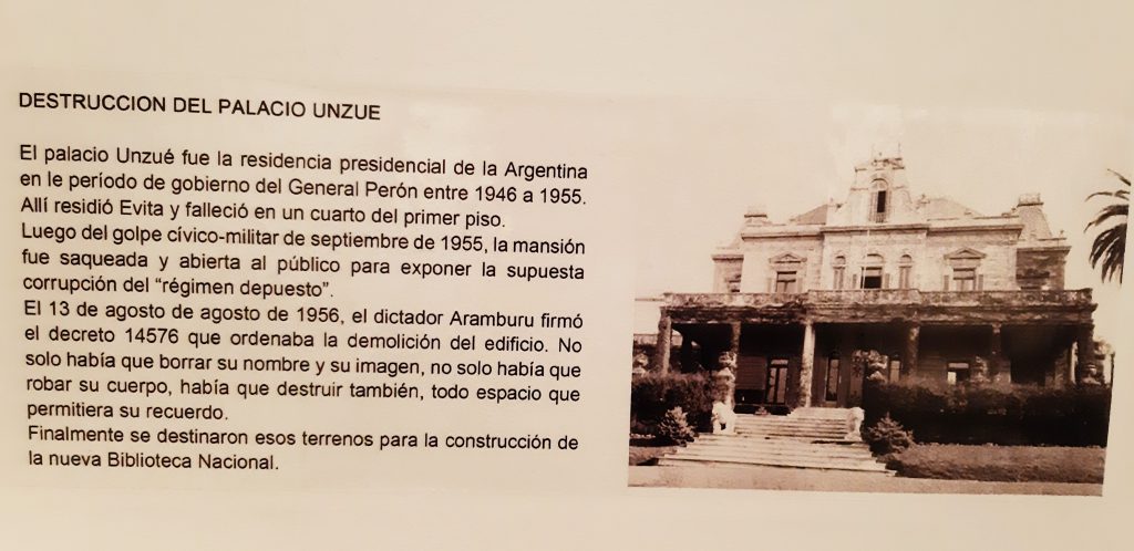 • O palácio em que o casal Perón viveu, foi destruído em 1955, a mando dos militares, quando assumiram o governo. No local foi construída a Biblioteca Pública Nacional.
