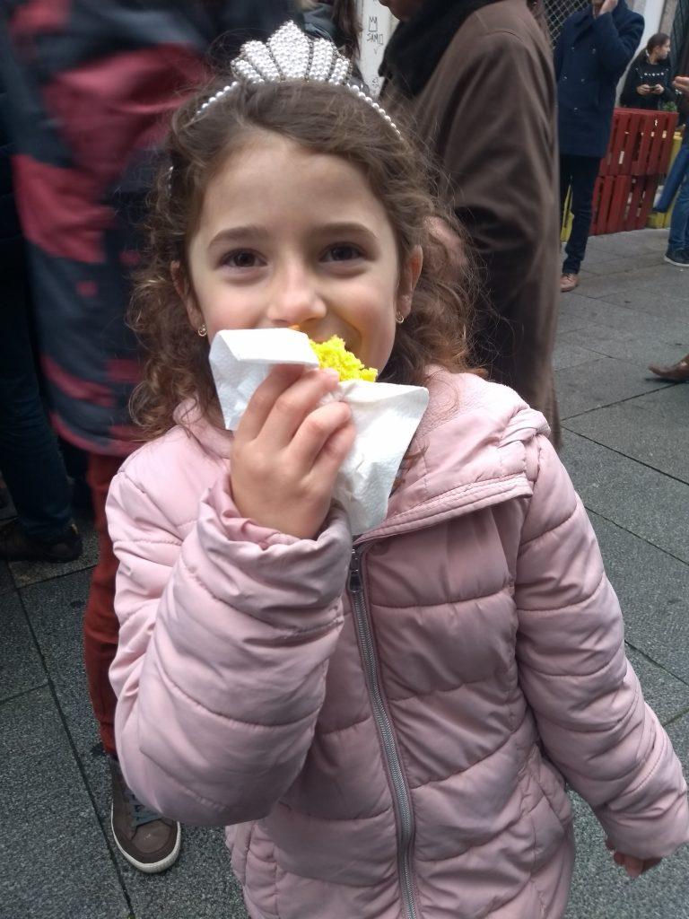 Como Braga recebe muitos turistas para participar dos festejos e procissões, tem um evento para marcar a abertura da Semana Santa e para dar as boas vindas aos visitantes e à população local. Claro que, junto com a família, eu fui conferir. O nome do evento me chamou atenção – PÃO DE LÓ GIGANTE! Na verdade, são colocados sobre uma mesa bem comprida, em pleno centro da cidade, vários pães-de-ló. A iniciativa é da Associação Comercial de Braga que convida as pastelarias da cidade para fazerem o bolo. Neste ano participaram 41 empresas. Tudo é distribuído de graça para as pessoas que passam pelo local.