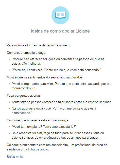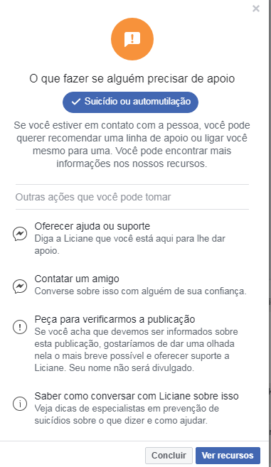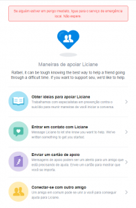 a ferramenta de prevenção ao suicídio. Funciona assim: ao perceber que um amigo postou um conteúdo que possa indicar uma tendência ao suicídio ou automutilação, o usuário pode escolher “denunciar a publicação”, clicando no canto direito superior do post, e depois escolher a opção “suicídio ou automutilação”