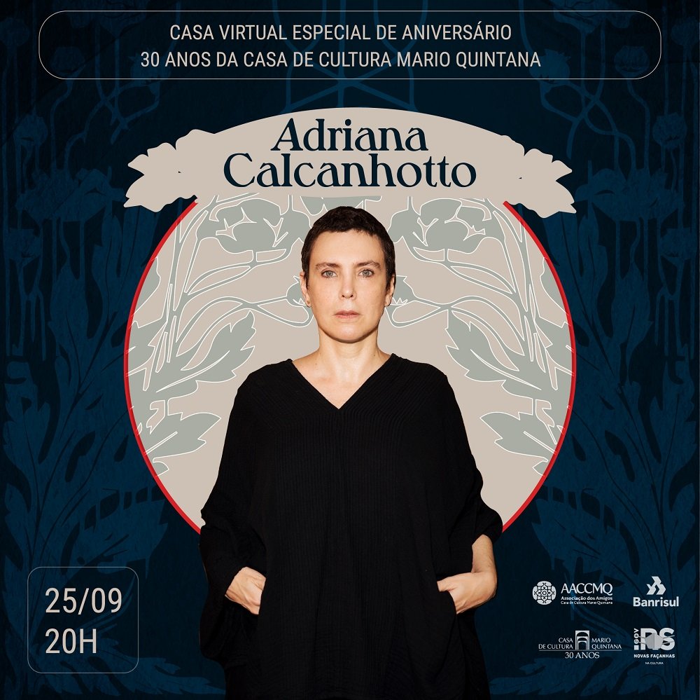 O repertório do show traz canções consagradas e novidades do mais recente trabalho da cantora e compositora, realizado durante a quarentena. Adriana também fará leitura de poemas para homenagear Mario Quintana, patrono da Casa de Cultura. A artista porto-alegrense, de carreira consolidada no cenário da música popular brasileira, traz ainda para a Casa Virtual um pouco de seu envolvimento com a poesia portuguesa. Entusiasta do legado de Fernando Pessoa e de outros poetas lusitanos, Adriana é embaixadora da obra de Mário de Sá-Carneiro no Brasil. A programação será transmitida pelo Instagram da CCMQ (@ccmarioquintana).